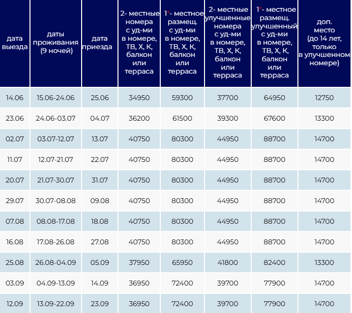 В стоимость входит: проезд на комфортабельном автобусе, проживание в гостинице 10 дней / 9 ночей, страховка пассажиров от несчастного случая на время пути, сопровождающий на маршруте.