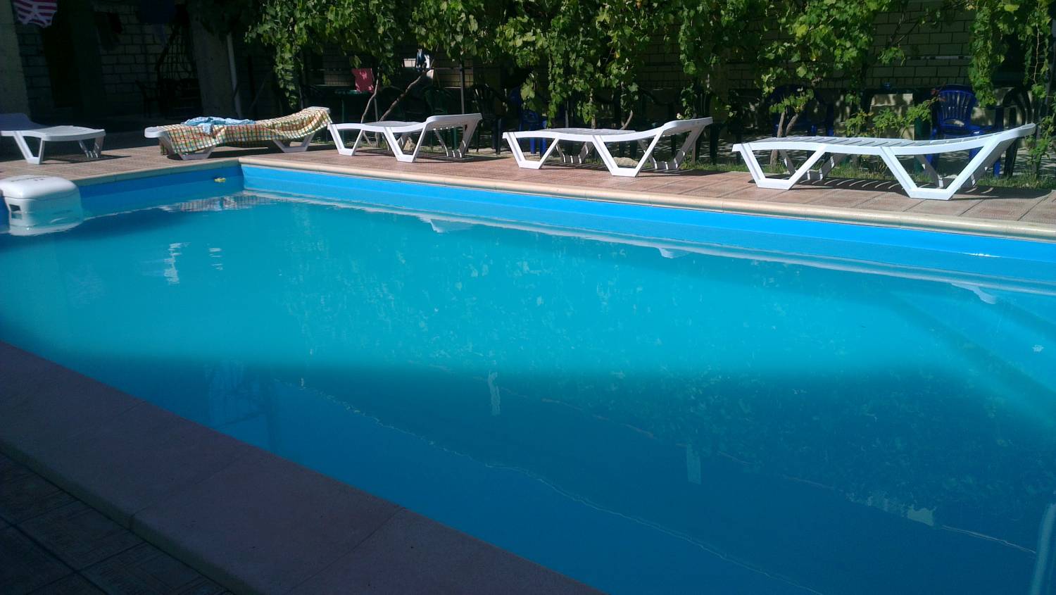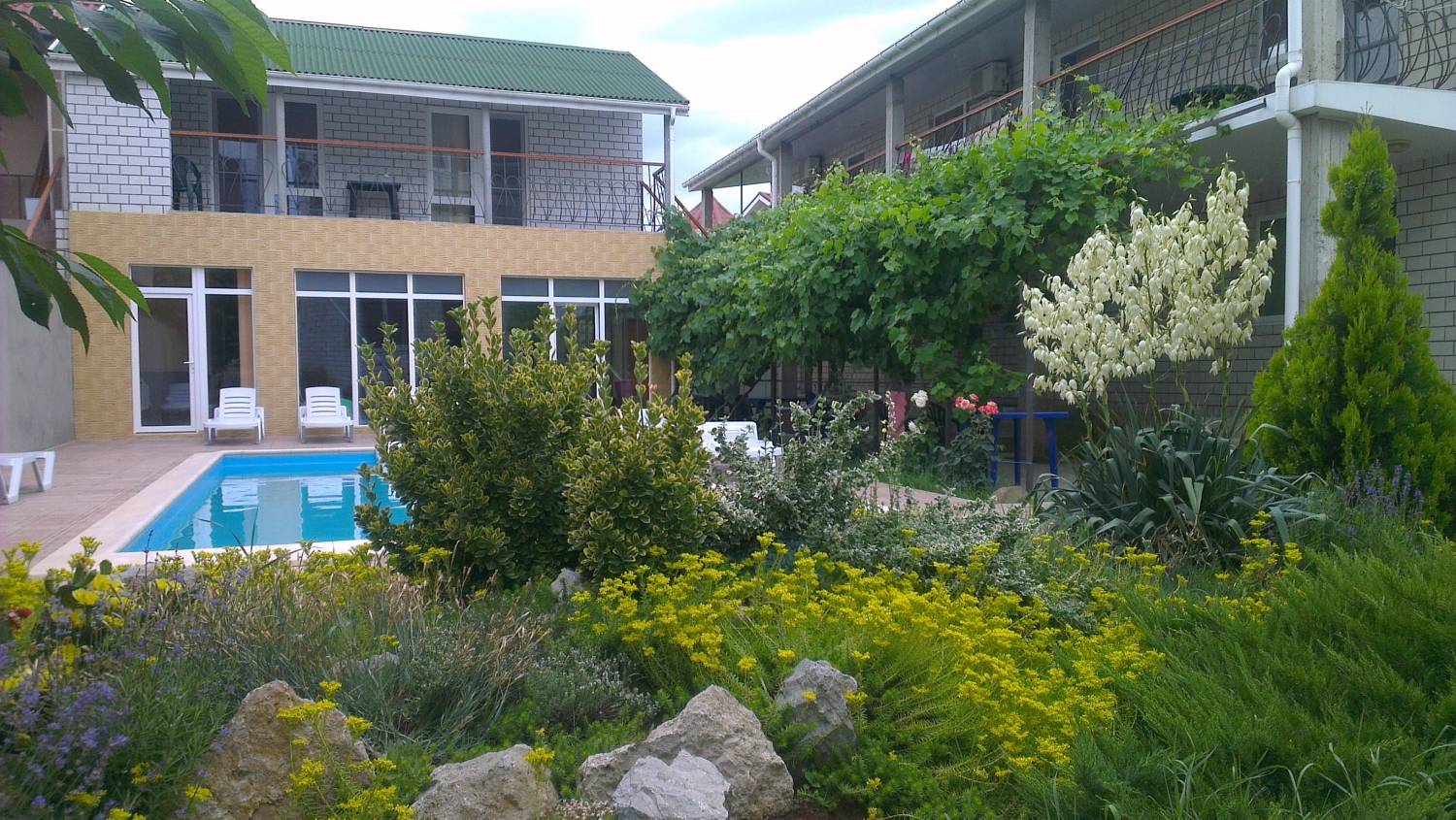 Гостиница находится в тихом месте, на территории частного домовладения. Обстановка способствует хорошему домашнему отдыху, большой двор. На территории к услугам гостей Wi-Fi, плавательный бассейн, шезлонги для загара, прудик с рыбками. По дороге на море в шаговой доступности столовая, кафе и рестораны, овощной мини рынок, фирменные магазины крымских вин, детская площадка, вещевой и продуктовый рынки (большой), супермаркет, магазин морепродуктов, на территории видео-наблюдение.